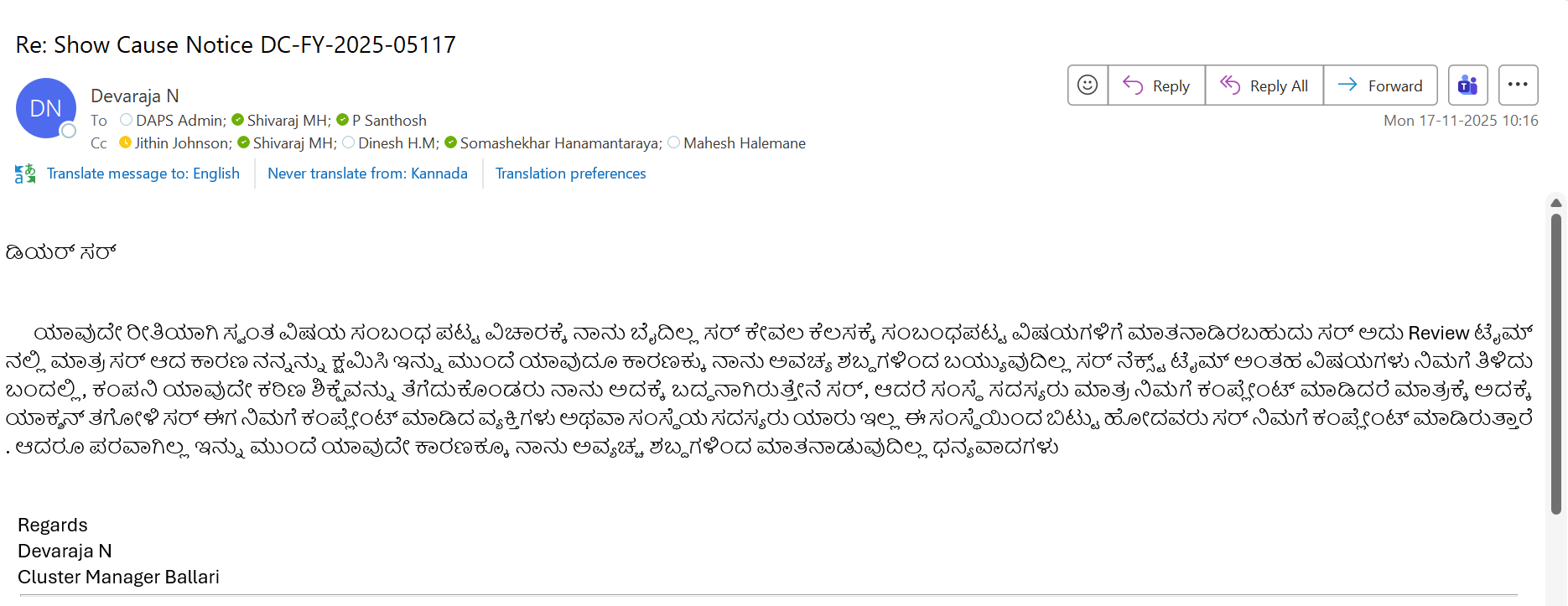 1762344677065_RE Inappropriate Behavioral Complaint Againt - Mr. Devaraja NSF0044724 Bellary-1KAGL0111 .msg